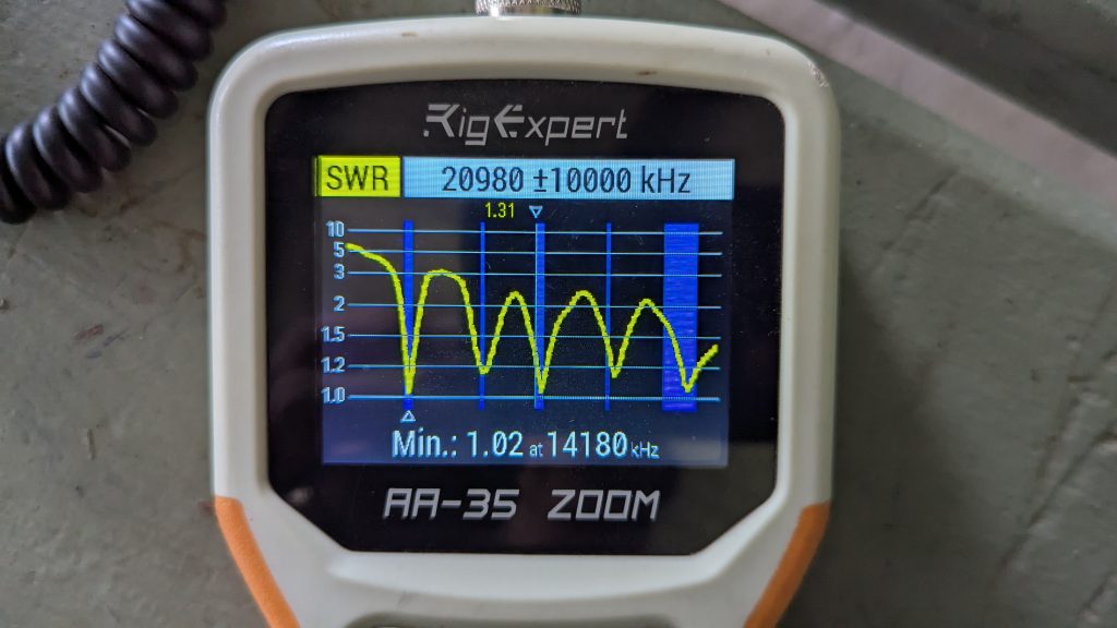 So, does it work? That’s yet to be proven, but it tests ok for a first approximation. There are good dips at most of the target frequencies. I had to trim the 20M element (as shown in the scan) to hit the band, cutting 6cm from each of the driven elements and 12cm from the reflector. Not shown here is the 6M band which had its best match at 50.6 MHz.